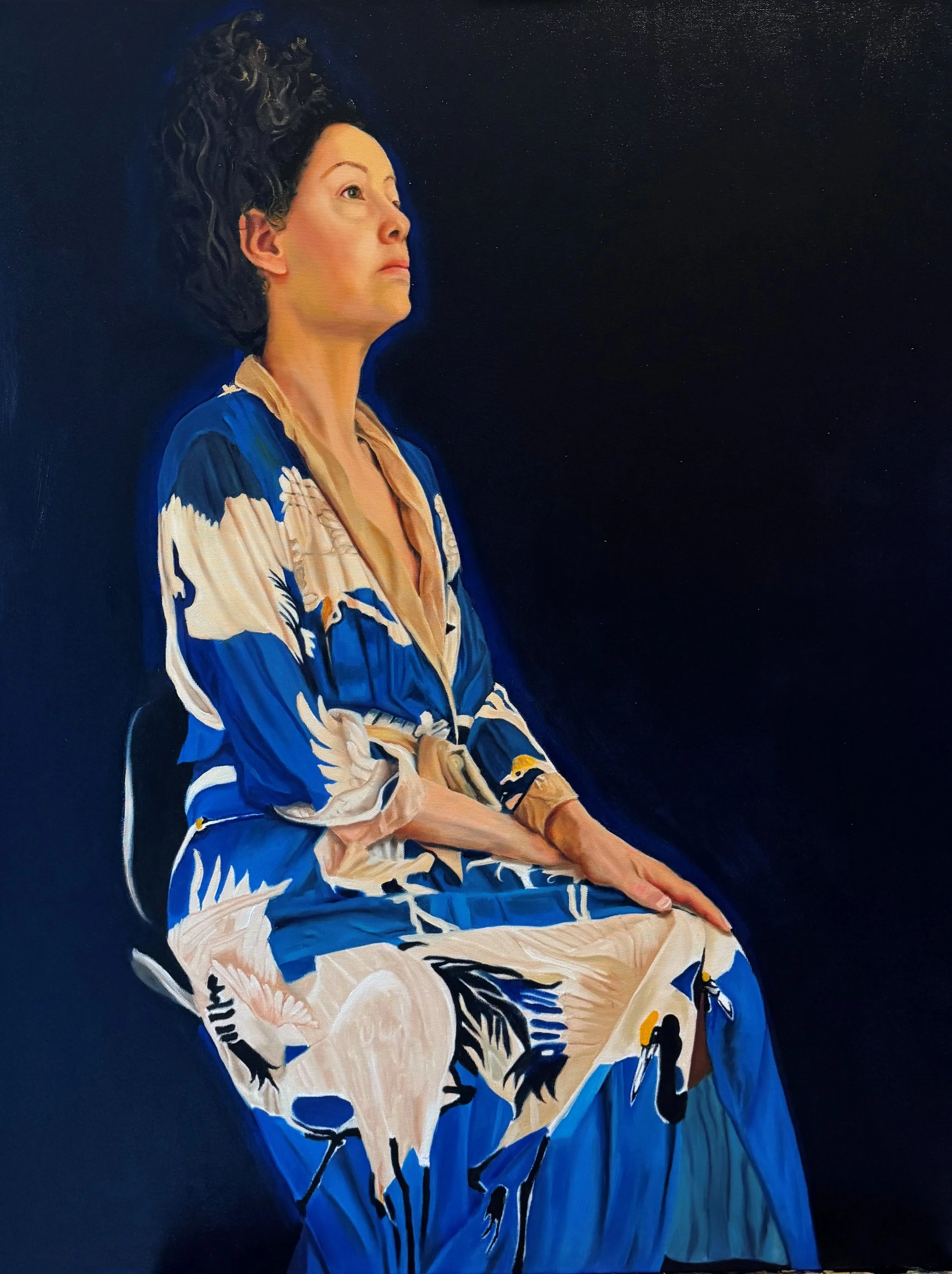 Set against a deep, almost infinite blue ground, the figure feels both grounded and alone. The darkness creates space—an emotional field rather than a literal interior—allowing the psychological state to take precedence over setting. The contrast between the rich blue and the pale cranes intensifies the sense of inward reflection: strength wrapped around vulnerability.